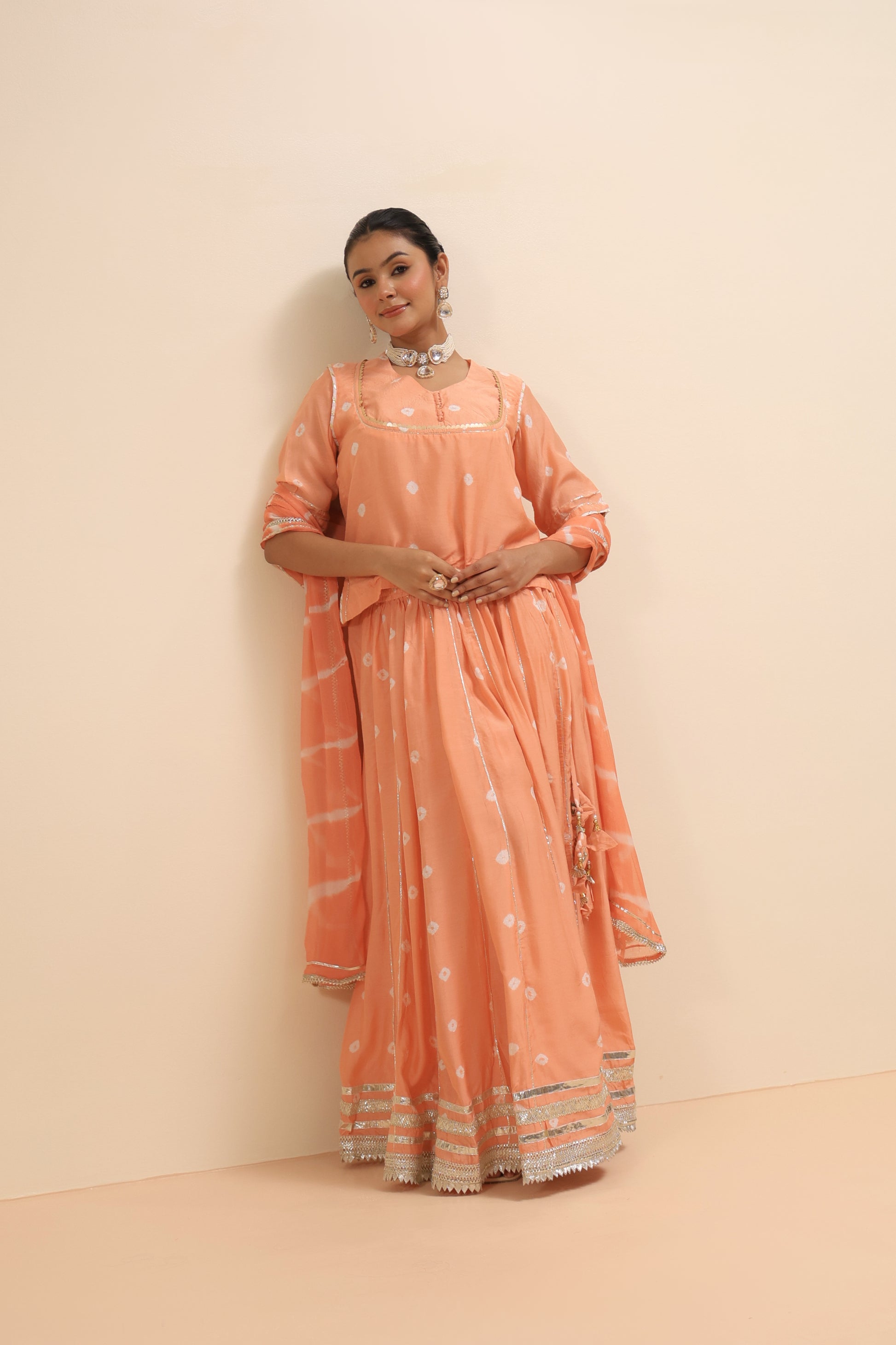 Discover grace and elegance with our Tie Dye Cotton Silk Lehenga Choli Set. Crafted from luxurious cotton silk, this ensemble features intricate sequins and gota embroidery for traditional charm, complemented by a contemporary tie-dye pattern.